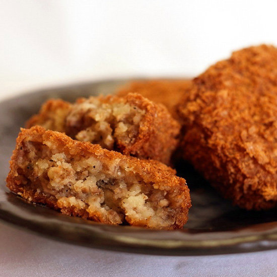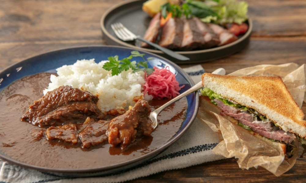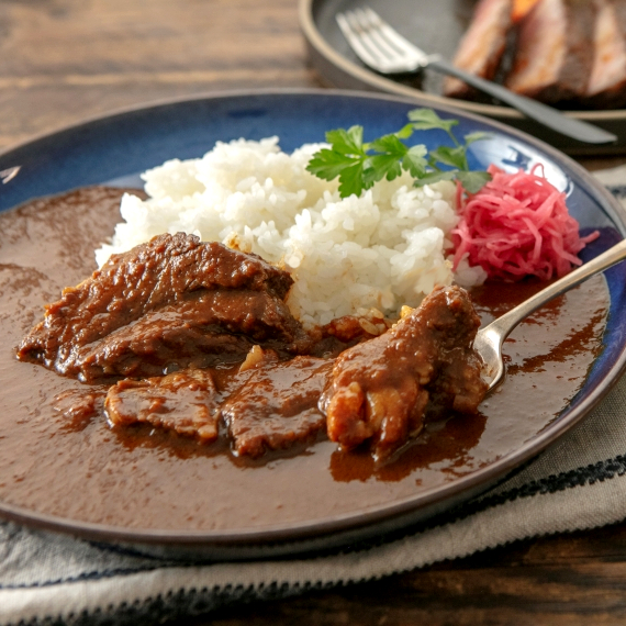 【銀のビーフカレー】カレーのベースとなるブイヨンは、たっぷり牛すじと数種類の野菜を煮込んだ出汁がベース。角切り肉ではなく、バラ肉を80g塊のまま使用。見た目はまるでステーキ!とろとろになるまで煮込んだお肉の塊をナイフとフォークで切り分けたり、スプーンでほぐしながらお召し上がりください。