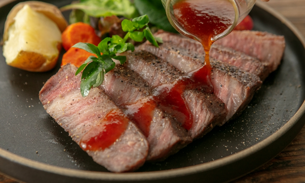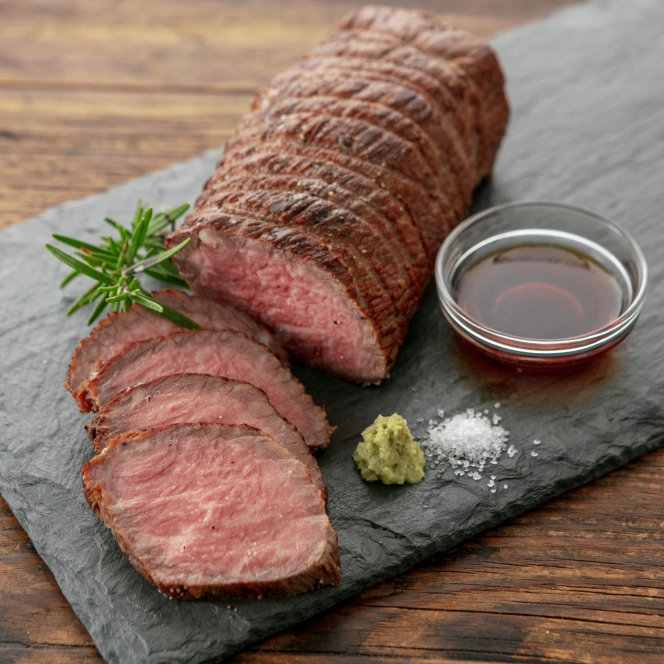 【サステナブル和牛熟ローストビーフ】サステナブル和牛”熟”は、100%黒毛和牛。通常月齢26〜28ヵ月の和牛と比べて、平均100ヵ月という長い年月をかけて肥育しています。赤身でお肉の旨味を存分に楽しんでいただける定番の「モモ」を使用したローストビーフ。程良い弾力とあっさりとした味わいはグルメな人にも納得していただける逸品です。