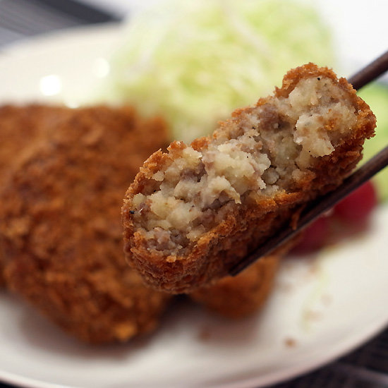 | 原材料名 | 豚馬鈴薯(国産)、牛肉(国産)、玉ねぎ(国産)、砂糖、醤油、食塩、 香辛料、 衣(パン粉、澱粉)/加工澱粉、調味料(アミノ酸)、トレハロース、 増粘多糖類、 (一部に小麦・乳成分・大豆・牛肉を含む) |